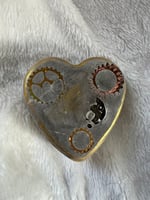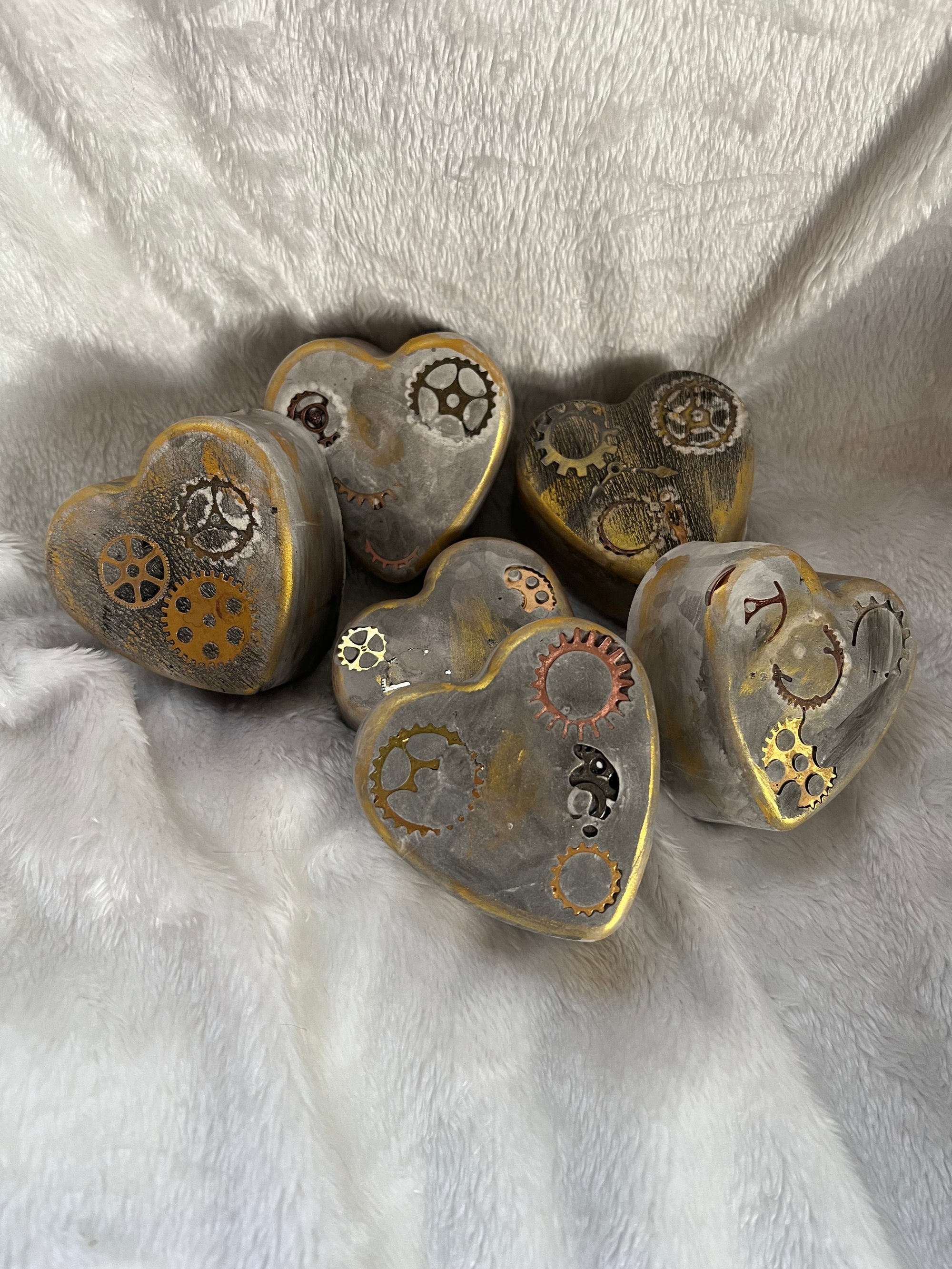 Plaster cast (3" long x 2" deep) of a Valentine heart, inlaid with metal cogs and gears, painted to look like faded, gilded concrete. Each is unique, yours will be chosen from the collection at random.
