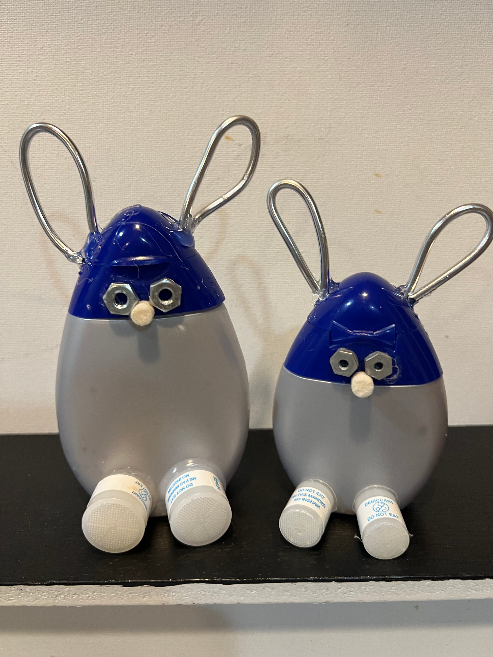 These Easter Bunnies are made entirely out of trash. Water enhancer squeeze bottles, spare wire, erasers, nuts, and dessicant bottle inserts combine to make a unique decoration. Very limited number available, from 3" to 4" tall.