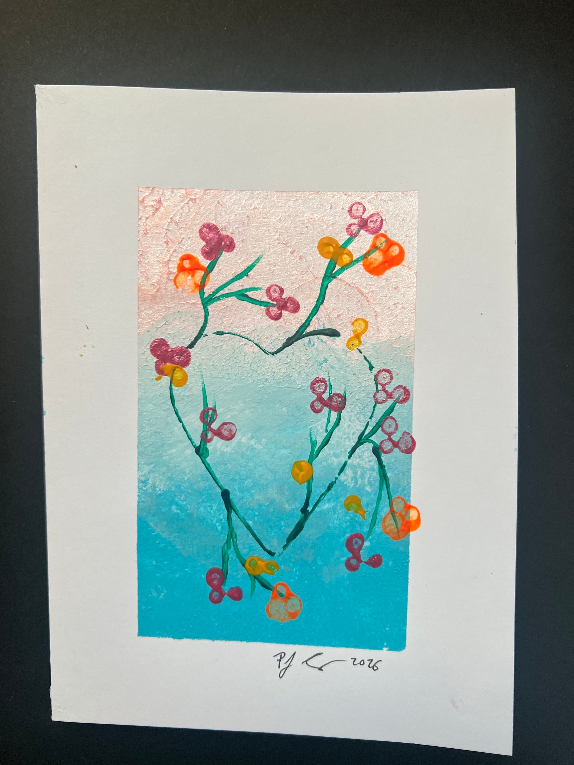 A bright, colorful pair of Valentine's Day cards with a floral heart wreath motif set against a metallic teal and pink background.